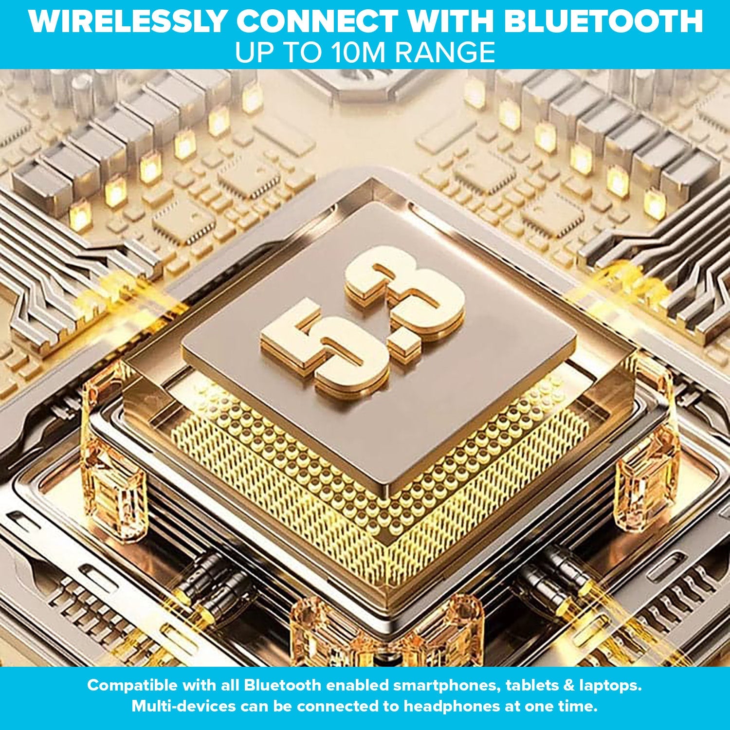 Connect to your phone and laptop with Bluetooth 5.3 technology. This update ensures the best sound quality and connection when playing your music. Operating distance is 10m. Combining active and passive noise reduction these headphones can significantly block out the low & mid frequency noises planes, car engines and train commutes create. Listen to your favourite movie, podcast or music in peace! Use the audio cable provided to plug into an aeroplanes audio system and sit back and enjoy hours of comfortable audio with the cushioned earpads which cover the whole ear.