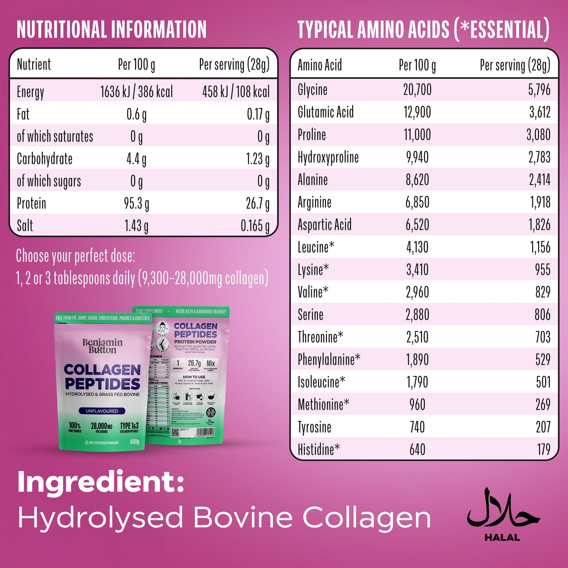 - Each serving provides 28,000mg of Hydrolysed Collagen Peptides and 26.7g of Protein