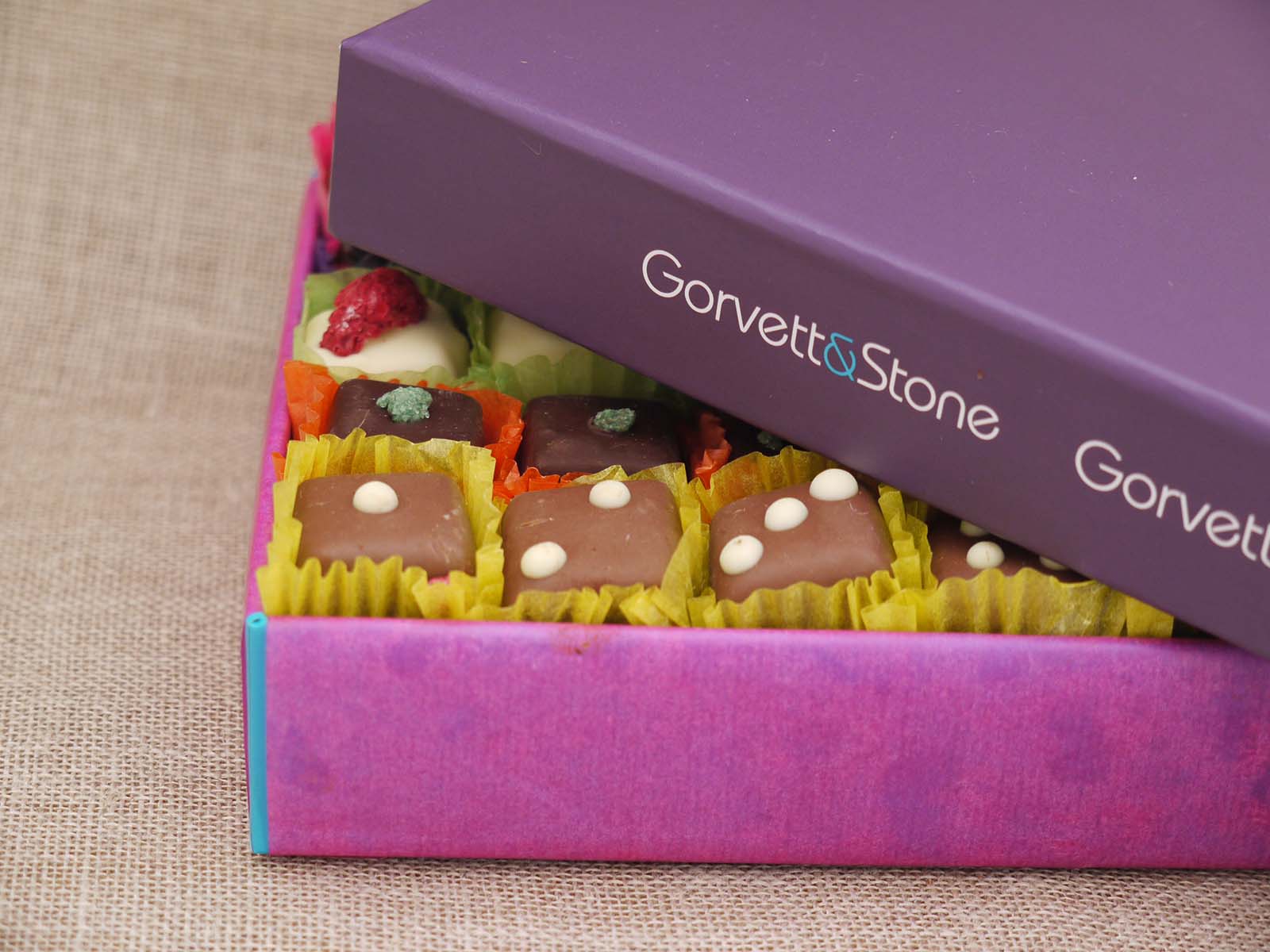 A selection of our delicious, luxurious, handmade artisan truffles, ganaches, pralines and marzipans. Dark, milk and white chocolates are produced in our Henley-on-Thames kitchen from sustainably sourced couverture and local ingredients, where possible. Stylishly packaged in our sturdy, fully recyclable Gorvett and Stone boxes, they make the perfect handmade gift with something for every palate. Available in 3 different sizes: baby, medium, large. For an extra memorable gift why not choose our Pyramid, All 3 boxes stacked and tied with a satin ribbon.