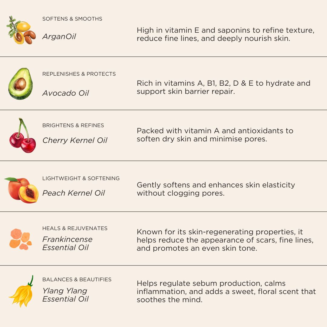 - Argan Oil - Softens the skin and reduces fine lines and wrinkles